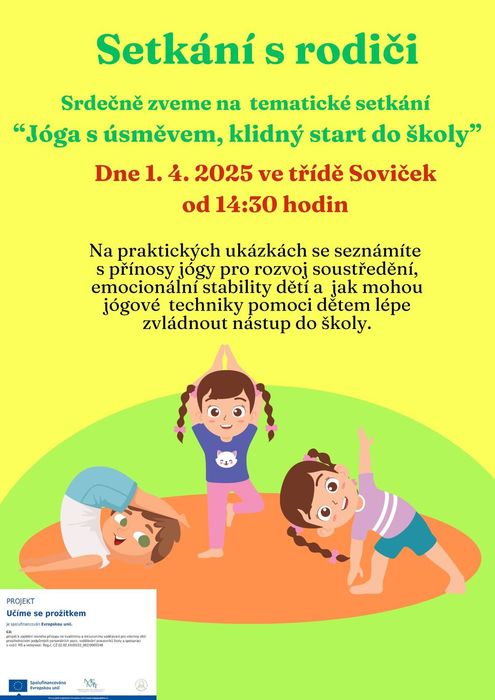 Zveme rodiče na setkání, které se uskuteční ve třídě Soviček dne 1. 4. 2025 od 14:30 hod. Na praktických ukázkách se seznámíte s přínosy jógy pro rozvoj pohybových a psychomotorických schopností a dovedností.