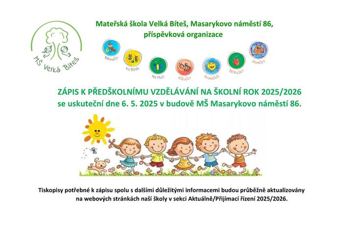 Zápis se uskuteční v úterý dne 6. 5. 2025 od 8,00 hodin ve společenském sále v budově MŠ Masarykovo náměstí 86. Zájemci se budou moci přihlásit v elektronickém předzápisu. Odkaz a potřebné informace naleznete na https://www.skolkabites.cz/prijimaci-rizeni-na-skolni-rok-2025-2026
