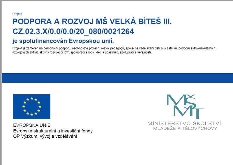 Mateřská škola Masarykovo náměstí a MŠ Lánice realizuje projekt Podpora a rozvoj MŠ Velká Bíteš II., který je spolufinancován Evropskou unií. Reg. číslo: CZ.02.3.X/0.0/0.0/20_080/0021264