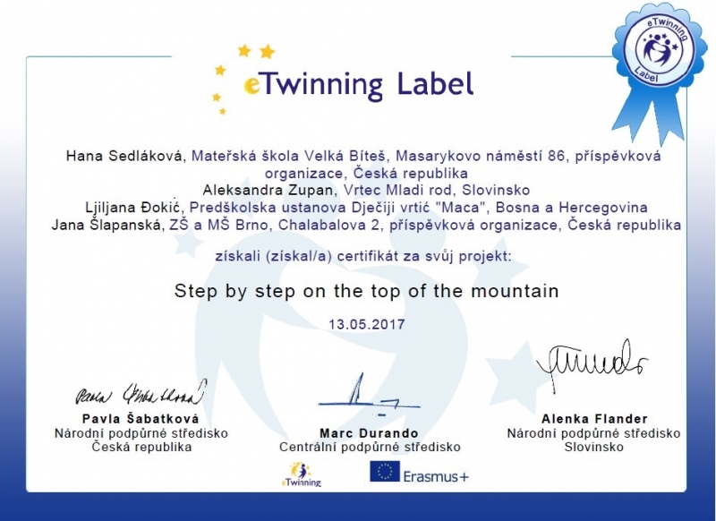 Děti ze třídy Sluníček MŠ Lánice, spolu se svými učitelkami, spoluvytvořily projekt v tzv. e-Twinningu. Projekt se jmenuje "Step by step on the top of the mountain" Krok za krokem na horu. Jedná se o mezinárodní spolupráci mateřských škol formou využití ICT. Od října 2017 do května 2018 bude na projektu spolupracovat s mateřskými školami ze Slovinska, ČR a Bosny a Hercegoviny.