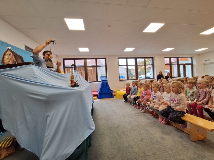 Ve středu 15. října 2025 k nám do mateřské školy opět zavítalo Dřevěné divadlo pana Hrubce. Tentokrát s pohádkou O zlaté rybce. V klasické, marionetami hrané, pohádce se děti dozvěděli, co se stalo když chudý rybář Giuseppe chytil zlatou rybku.