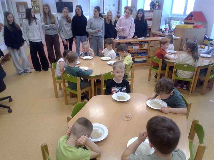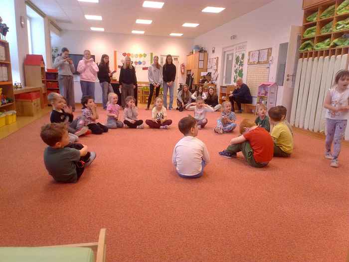 Po přivítání se žákyně zapojily do řízené činnosti, kterou jsme si pro děti připravili. Měly tak možnost sledovat, jak probíhá organizace aktivit, jak pracujeme s dětmi různého temperamentu a jakým způsobem je vedeme k pozornosti, spolupráci a samostatnosti.
