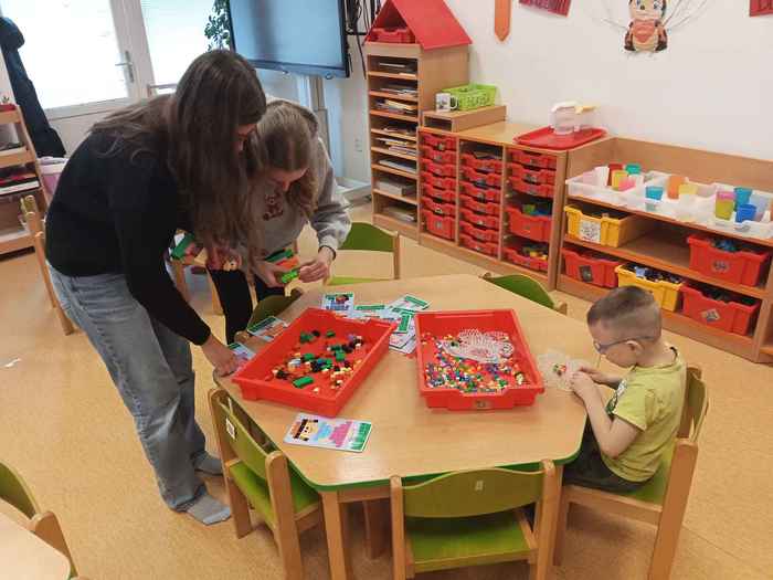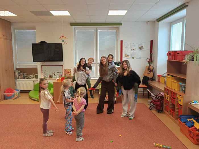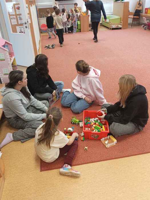 Následovala volná hra, během níž se žákyně aktivně zapojily mezi děti. Společně si hrály, stavěly, povídaly si a poznávaly, jak důležitá je komunikace, trpělivost a schopnost reagovat na potřeby jednotlivých dětí. Pro mnohé z nich to byla první zkušenost s takto malými dětmi, a o to cennější pro jejich další rozhodování.