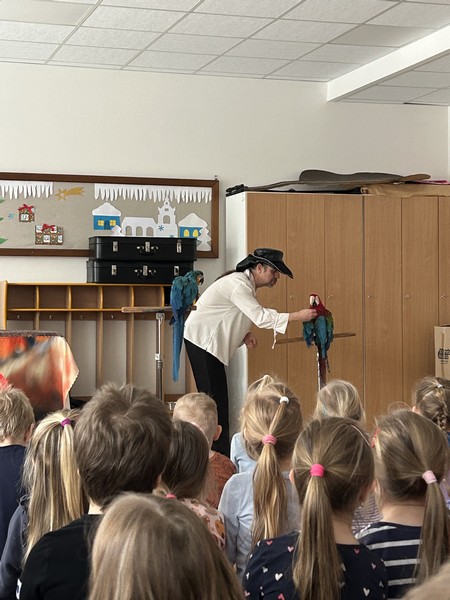 Ve čtvrtek 13. 2. 2025 nás v naší školce navštívili manželé Netoličtí s jejich papouščími kamarády Aráškem a Šmudlou. Děti se dozvěděly, čím se papoušek živí, co má rád, co umí, kde žije a další důležité informace pokud by jednou chtěly mít také papouška. Papoušci dětem také předvedli spoustu dovedností, jako například vyšroubování šroubku nebo hod míčku do basketbalového koše, jízdu na kole nebo jak krásně umí mluvit.